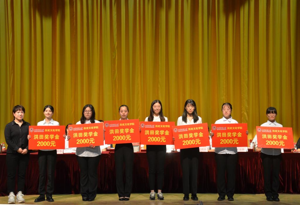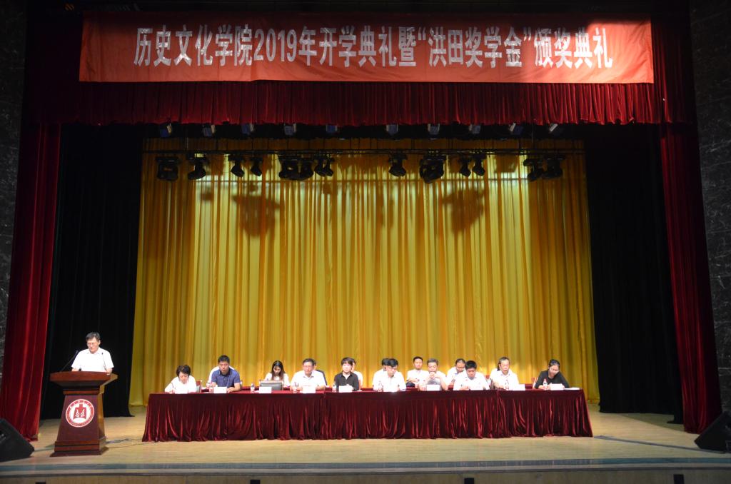 9月22日下午,历史文化学院2019年开学典礼暨“洪田奖学金”颁奖仪式在大学生活动中心礼堂举办。财信众联会计有限公司办公室主任朱传芝与市场部主任候川,我校国内合作处处长孔宪福,历史文化学院领导班子,出席典礼。学院教授代表、各教研室主任、辅导员及2019级研究生、本科生新生,参加了典礼。典礼由历史文化学院党委副书记王建阳主持。