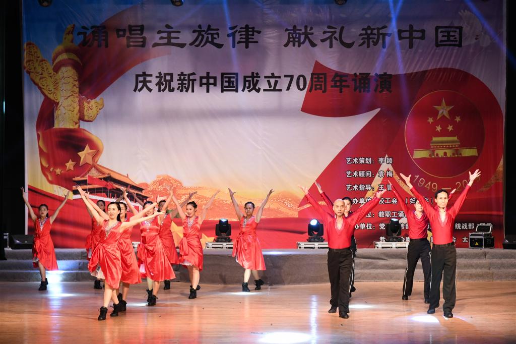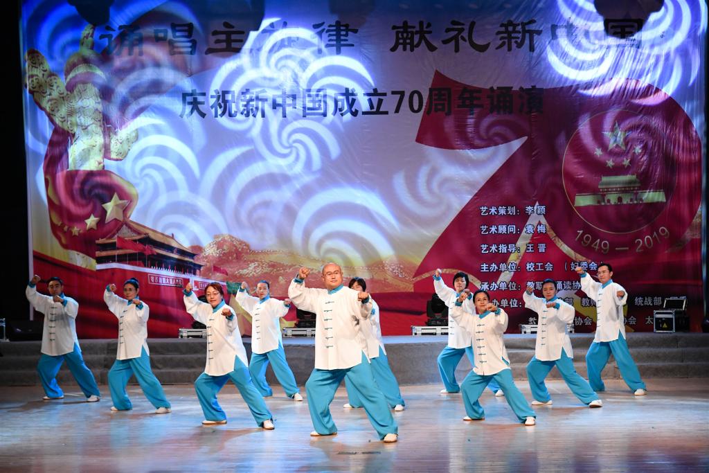 本次演出活动由我校教职工协会自主发起、职工自发参与。在学校党委宣传部、教师工作部、统战部、校工会(妇委会)、团委等部门的大力支持下,教职工诵读协会、合唱协会、舞蹈协会以及太极拳协会通力合作,共同为新中国七十华诞献礼,用诗歌、舞蹈、太极等我国经典的传统文化形式表达对祖国的深情热爱。