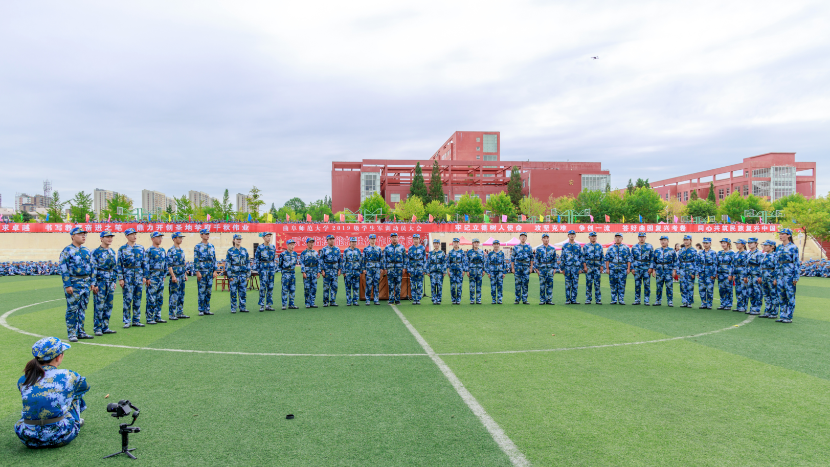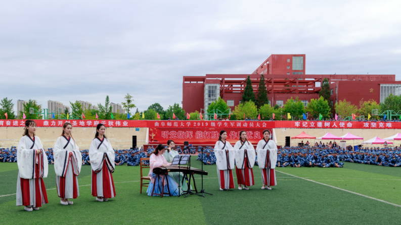 活动伊始,华体会官方网页版_华体会(中国)古谱诗词传唱团队——采薇组合深情演唱了《临江仙》、《长相思》、《暗香》三首古谱诗词作品。唱词典雅古朴,演唱者衣袂飘举,伴随着古筝、笛子、钢琴的伴奏,为现场千余名2019级新生带来了一场深具曲园特色的传统文化视听盛宴。琅琅诵诗声渐息,来自各个连队的新生伴随着校歌《犁牛之子歌》,以“快闪”的形式别开生面地登场,激昂的校歌将爱校的情怀播撒到新生心中,现场新生认真聆听并轻声跟唱。