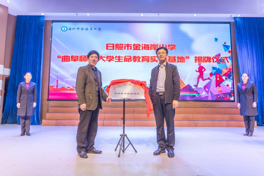 仪式上,赵庆英和学生生命教育研究中心团队负责人卢瑞霞签订华体会官方网页版_华体会(中国)与日照市金海岸小学生命教育实践基地合作协议,杨永明和宋百合共同为我校生命教育实践基地揭牌。