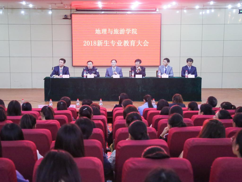 为引导2018级新生顺利适应大学生活新节奏,明确学习目标,合理规划大学生活,10月15日,地理与旅游学院举行2018级新生专业教育大会。学院党委书记胡长春、院长张全景、副院长吕晓、吴军,大学城派出所教导员秦绪平,出席大会。学院团委书记、2018级辅导员宁晓文,2018级班主任石峰、王萍、刘飞、贾维花、张岩君、孙丕苓、张琦,以及学院2018级全体新生、2017级学生干部代表,参加大会。大会由学院党委副书记刘伟主持。