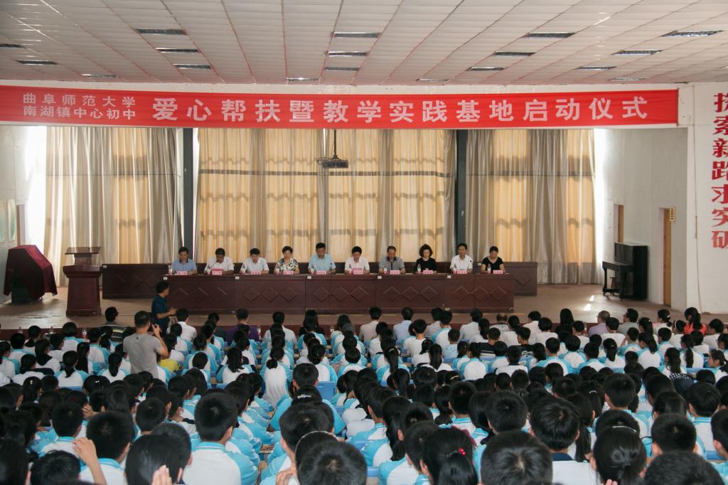 6月28日,我校爱心帮扶暨教学实习基地、社会实践基地揭牌仪式在日照市南湖镇中心初中顺利举行。学生工作处处长杨永明、信息科学与工程学院党委书记张书东、日照校区机关党委书记林平、校团委书记宋国栋、音乐学院党委书记周彩霞、日照市东港区副区长何昭波、东港区教育局局长宋百合等领导,我校日照校区机关党委、音乐学院及信息科学与工程学院的教工党员代表、日照市东港区相关部门、南湖镇中心初中师生代表参加了活动。