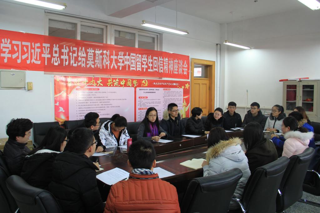 12月30日,习近平总书记给莫斯科大学的中国留学生回信,勉励他们胸怀大志、刻苦学习、早日成才,并向所有海外学人致以节日问候。1月6日下午,我校团委举办“学习习近平总书记给莫斯科大学中国留学生重要回信精神”座谈会,校团委、翻译学院等相关部门负责人、学生骨干和学生代表参加座谈会,我校2015级留俄学生在当地举行了主题团日活动,深入学习总书记给莫大中国留学生的回信。