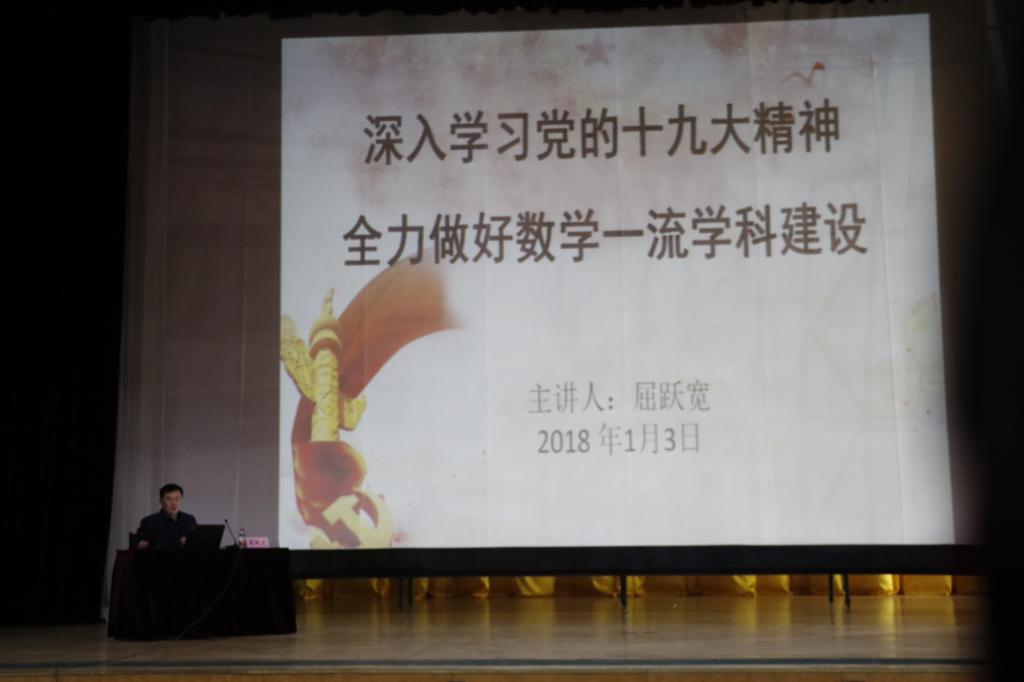 为深入贯彻学习党的十九大精神,准确把握十九大内涵,1月3日,数学科学学院党委书记屈跃宽在大学生活动中心礼堂作了题为“深入学习十九大精神,全力做好数学一流学科建设”的专题党课。数学科学学院师生代表参加了学习。