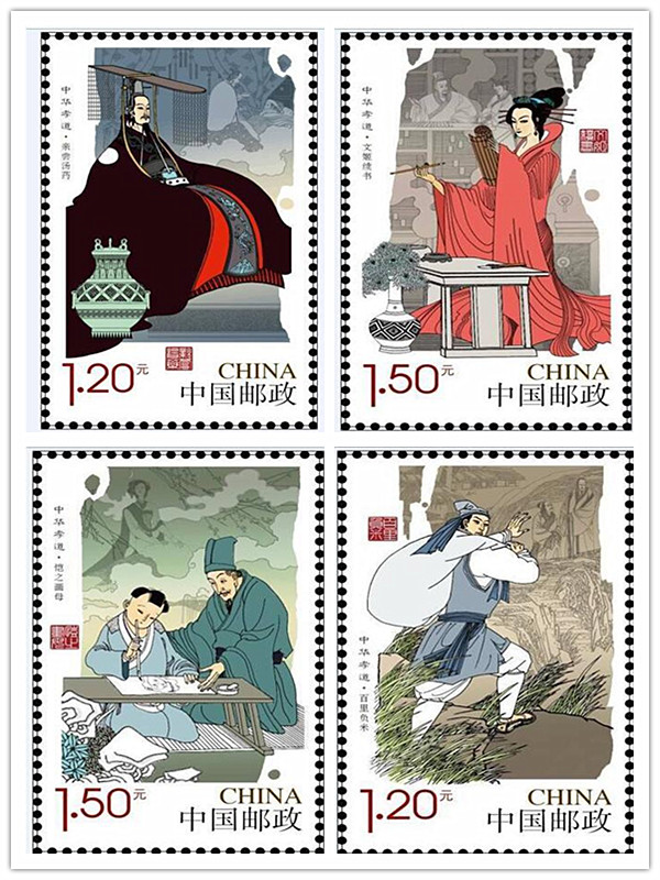 《中华孝道(二)》特种邮票1套4枚,选取了仲由“百里负米”、文帝“亲尝汤药”、“文姬续书”、“恺之画母”四个中华孝道经典故事。全套邮票面值5.40元。由著名画家卢延光、曹国伟、蒙复旦以装饰线描的手法绘制,采用胶雕套印工艺印制,人物造型夸张,身材颀长,色彩处理主次分明,画面气氛古风浓郁,不仅具有历史时代感,更有情感感召力。