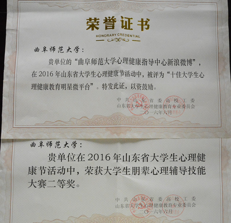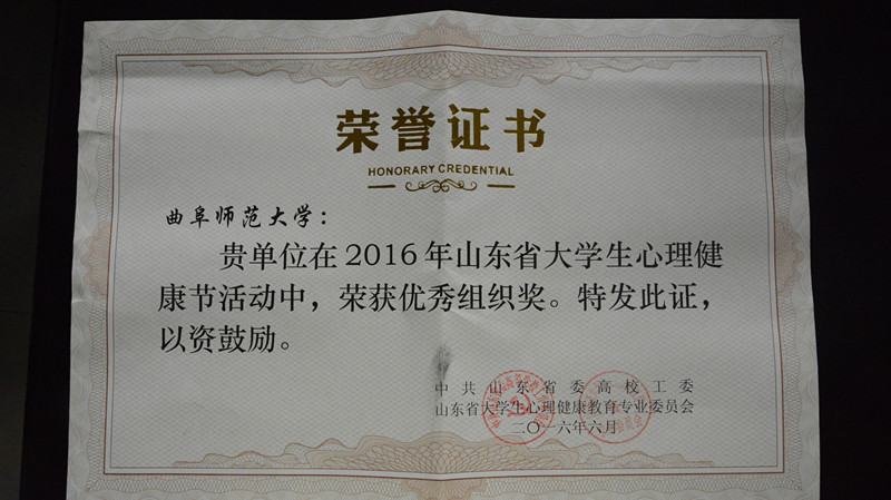 近日,《中共山东省委高校工委关于表彰2016年山东省大学生心理健康节优秀组织单位、优秀指导教师及系列活动获奖项目的决定》(鲁高工委〔2016〕22号)文件对2016年山东高校大学生心理健康节优秀组织单位、优秀指导教师、获奖项目及获奖作品进行表彰,我校喜获多项荣誉。