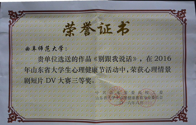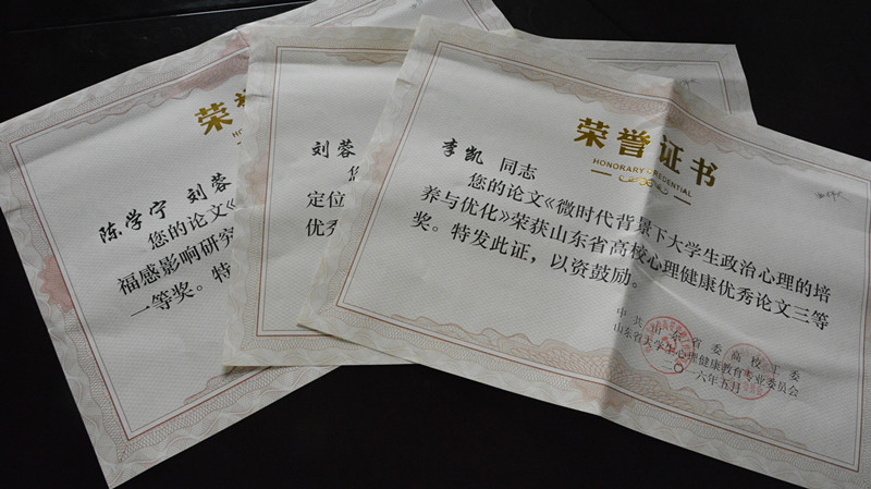 我校被评为“山东省2016年大学生心理健康节优秀组织单位”,荣获山东省高校大学生朋辈心理辅导技能大赛二等奖,心理健康指导中心新浪微博被评为“山东省高校十佳大学生心理健康教育明星微平台”,陈学宁、刘蓉老师的论文《特殊群体大学生归因方式对主观幸福感影响研究》获心理健康优秀论文一等奖,李凯老师的论文《微时代背景下大学生政治心理的培养与优化》、刘蓉老师的论文《面向“橄榄型”社会的大学生社会定位积极心态塑造研究》获心理健康优秀论文三等奖,心理DV剧作品《别跟我说话》获得心理情景短剧DV大赛三等奖。