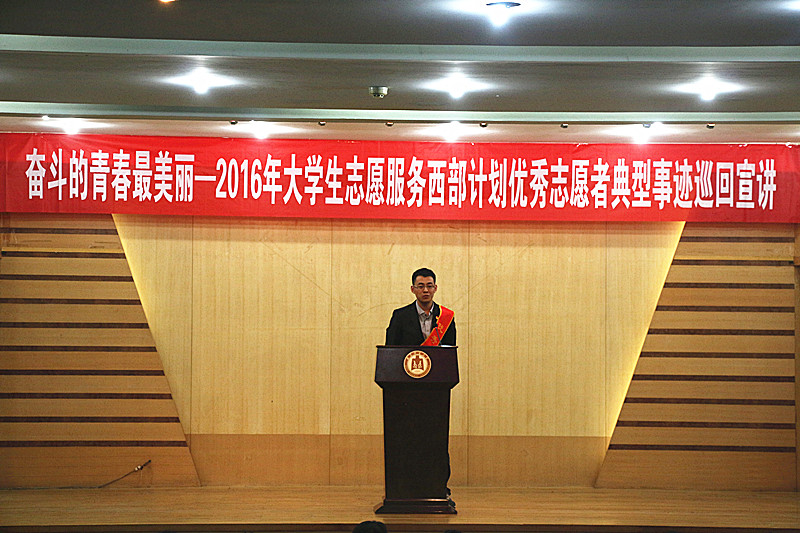 4月15日下午, 2016年大学生志愿服务西部计划优秀志愿者典型事迹宣讲会在孔子会堂举行。我校2012届外国语学院毕业生西部优秀志愿者徐静,山东科技大学毕业生田春雨等五位同学进行了精彩演讲。自治区团委志工部主任武桐羽,团山东省志工部主任刘杰,校团委负责同志出席了活动。