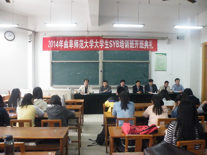 4月23日下午,我校2014年大学生SYB培训班在综合楼105开班。曲阜市人力资源和社会保障局副局长刘成震、曲阜市技工学校副校长郑怀忠、我校招生就业处、学生工作部、团委等相关单位负责人出席了本次开班仪式。