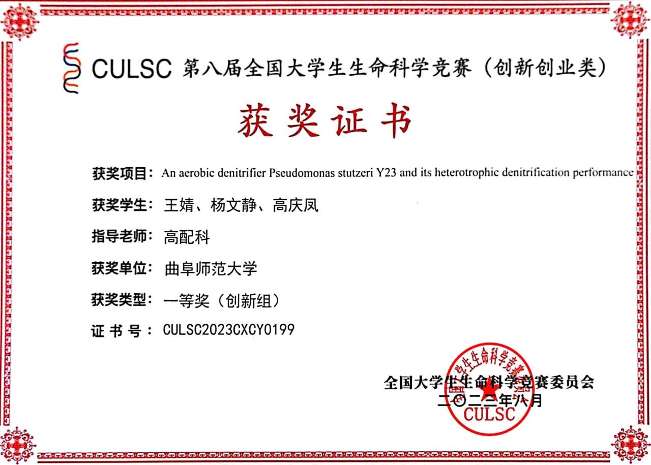在本届竞赛中,曲阜师大生命科学学院的22个项目和化学与化工学院的2个项目从初赛的众多作品中脱颖而出,经过山东省赛区复赛的激烈角逐,一路闯进全国决赛并斩获佳绩。最终,在创新组中有10个项目获奖,其中生命科学学院高配科老师带队指导的“An aerobic denitrifier Pseudomonas stutzeri Y23 and its heterotrophic denitrification performance”项目和化学与化工学院公培伟老师和王丹丹老师带队指导的骨关节炎药物载体仿生构筑及其润滑机理研究”项目获得创新组一等奖,3个项目获得二等奖,5个项目获得三等奖;在创业组中有3个项目获奖,其中2个项目获得二等奖,1个项目获得三等奖。