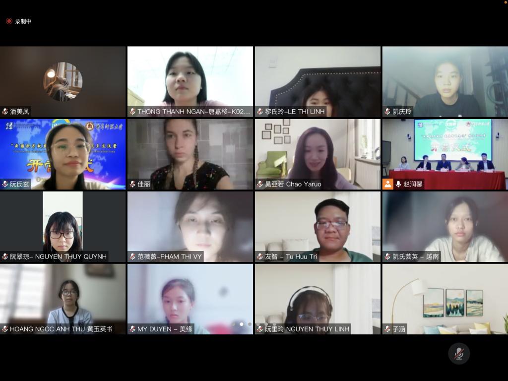 随后马达加斯加籍国际学生文彬和李希杰演唱了中文歌曲《情歌》,越南籍国际学生杜氏水和吴氏秋芳带来了中国风舞蹈表演《借月》,学校书法学院的潘禹彤同学现场展示了书法作品,一个个精彩的节目,将开营仪式的气氛推向了高潮,线上学员纷纷留言评论。