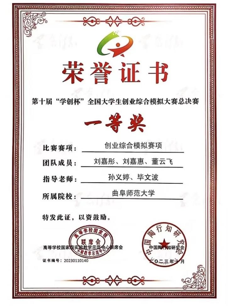 曲阜师大经济学院讯 1028-29日,第十届学创杯全国大学生创业综合模拟演训活动创业综合模拟赛项总决赛在黑龙江大学落下帷幕,历经层层选拔、激烈角逐,曲阜师大经济学院学生刘嘉彤、刘嘉惠、董云飞组成的团队斩获国家级一等奖。孙义婷、毕文波两位老师被评为优秀指导教师。