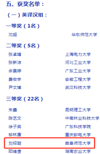 曲阜师大翻译学院讯  12月1日,第六届“上电杯”全国科技翻译大赛获奖名单正式公布,曲阜师大翻译学院荣获优秀组织奖,宋兆娟副教授指导的2021级商务英语专业刘绍璇同学荣获英译汉组三等奖。
