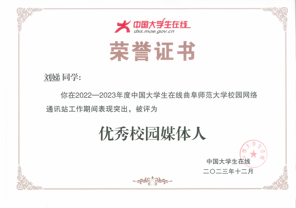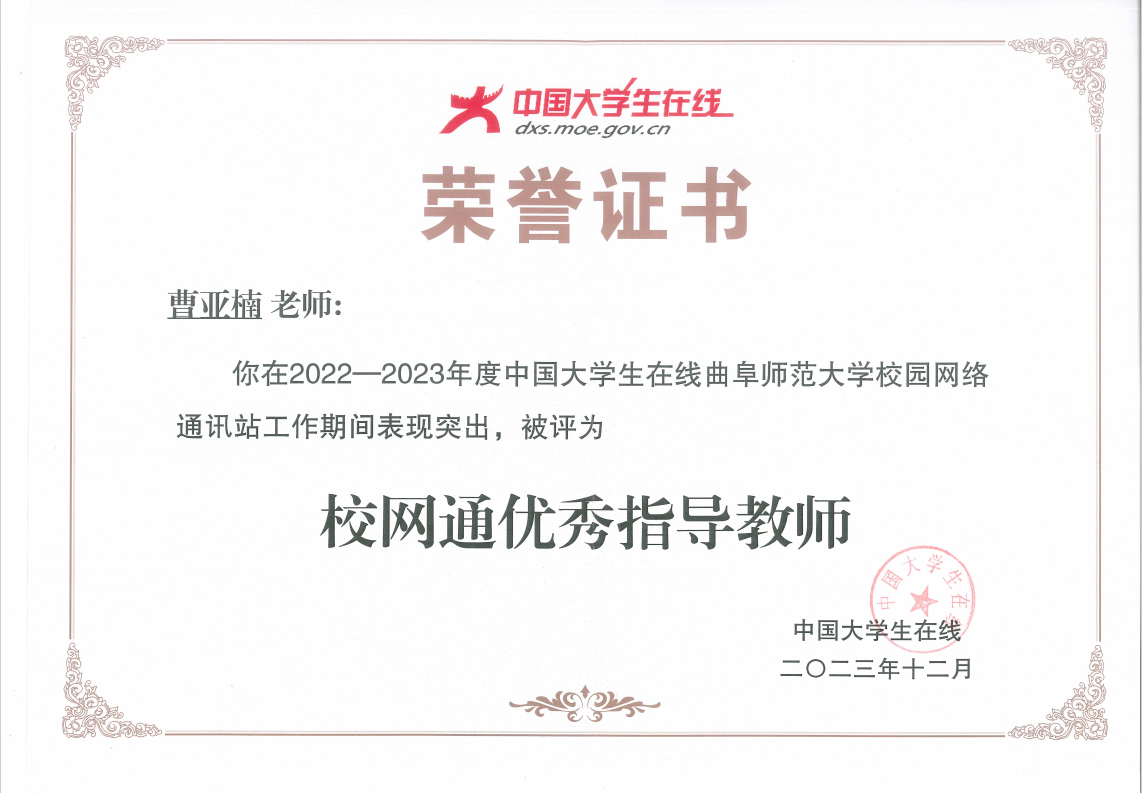 曲阜师大学生工作处讯 近日,中国大学生在线平台发布了《中国大学生在线校网通及校园行活动2023年度表彰名单》,曲阜师大获得多项荣誉。曲阜师大中国大学生在线网通站——华体会官方网页版_华体会(中国)学工在线获“优秀校网通站”称号,曲阜师大学生工作处获“校园行新星单位”称号,原创作品《第9次夺冠!再次获得“双料冠军”!》获评“年度优秀内容”,学生工作处曹亚楠老师获“校网通优秀指导教师”称号,心理学院学生、曲阜师大中国大学生在线校网通站站长刘娣获“优秀校园媒体人”称号。