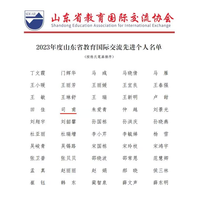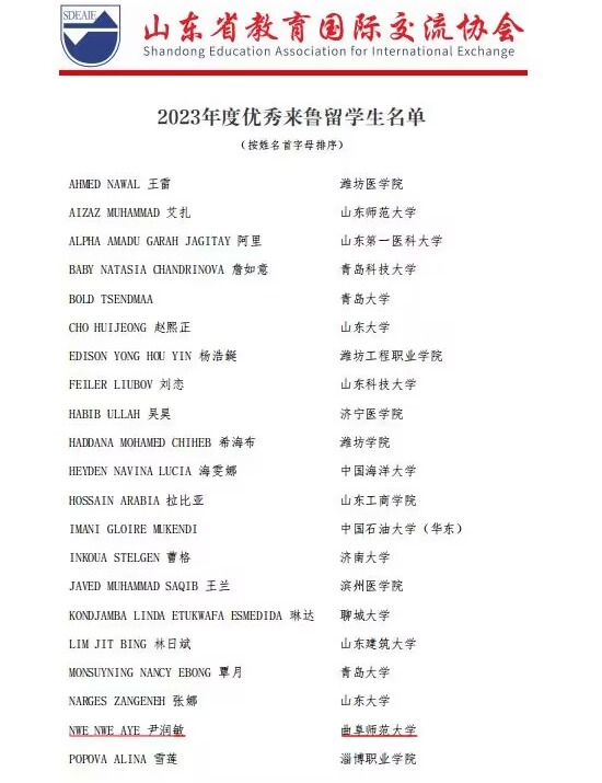 曲阜师大国际教育学院讯 近日,山东省教育国际交流协会公布了关于表彰2023年度山东省教育国际交流先进单位及先进个人、山东省教育系统优秀外国专家和优秀来鲁留学生的名单,国际教育学院辅导员司甫被评为2023年度山东省教育国际交流先进个人,缅甸籍留学生尹润敏被评为2023年度优秀来鲁留学生。