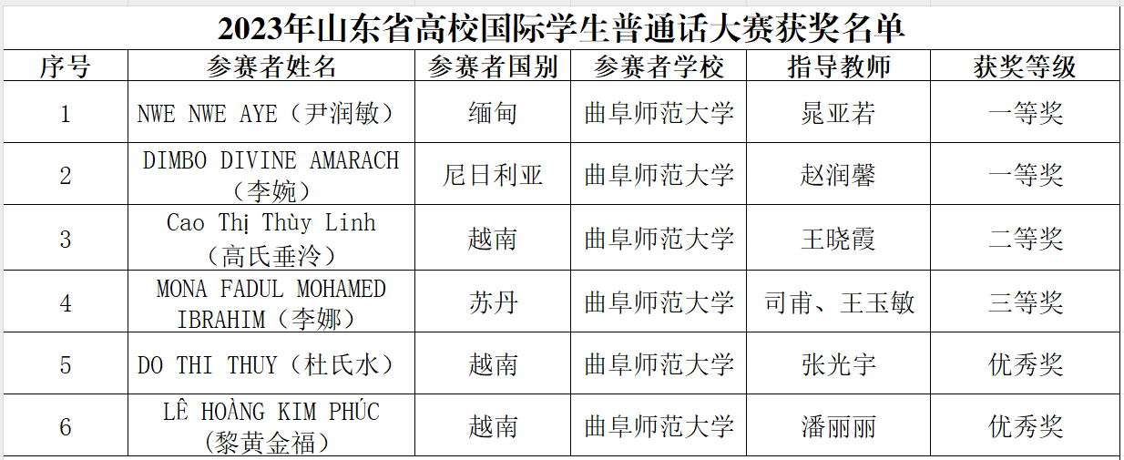 近日,山东省教育厅对2023年山东省高校国际学生普通话大赛获奖名单进行公示,曲阜师大获得一等奖2项,二等奖1项,三等奖1项,优秀奖2项;一等奖共设5名,曲阜师大分获第一名和第五名。同时,晁亚若、赵润馨、王晓霞荣获优秀指导教师,华体会官方网页版_华体会(中国)荣获优秀组织奖,朱献贞荣获优秀组织工作者。