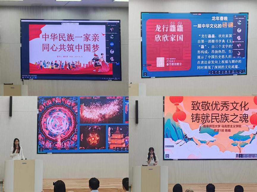 活动中,四位学生代表通过丰富的理论知识和鲜活的人物故事,带领同学们共同致敬传统文化,探寻民族魅力。