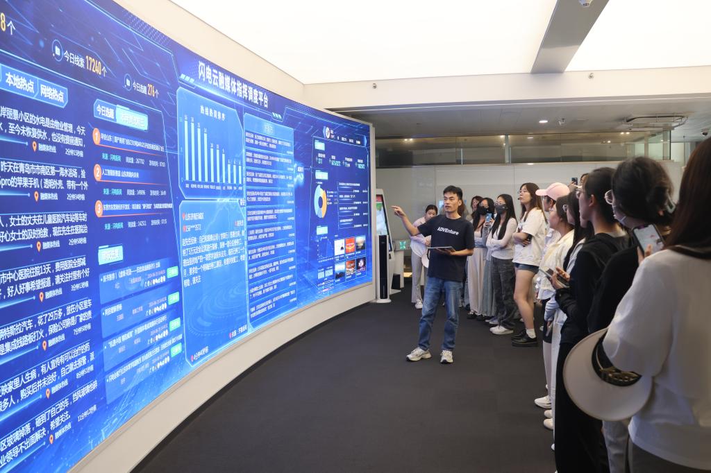 师生一行首先参观了山东省广播电视台,深入了解电视、网络和客户端等整合互动传播的全新新闻采编播发的具体流程,感受“一次采访、分类制作、定向推送、多屏分发”模式的魅力所在。工作人员详细讲解了“中央厨房”和集成室的组织架构、运行机制以及新闻大数据应用,带领学生深入了解新闻作品从选题策划、采访编辑到审核发布的全流程,引导学生直观认识到电视节目的录制、制作和播出的生产全过程,让学生切实感受到数字化和智能化技术在新闻生产、节目制作中的实际应用,真切地理解全媒体时代新闻媒体的转型之路和对新闻工作者的新型要求。