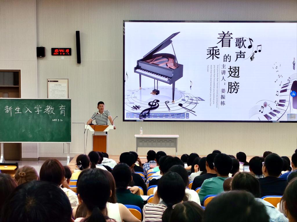 马克思主义学院讯 为深入贯彻落实习近平总书记关于“大思政课”建设和做好美育工作,弘扬中华美育精神,让祖国青年一代身心都健康成长的重要指示批示精神,为丰富马克思主义学院2024级新生德育教育、美育教育形式,引领学生树立正确的审美观念、陶冶高尚的道德情操、塑造美好心灵,9月12日晚,马克思主义学院党委副书记姜振栋为2024级新生讲授了题为“乘着歌声的翅膀”的音乐思政课。