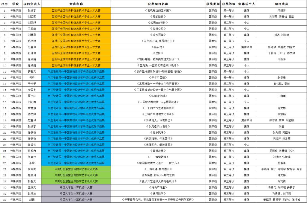 传媒学院讯 近日,我校传媒学子在蓝桥杯全国软件和信息技术专业人才大赛、中国好创意暨全国数字艺术设计大赛等多项国家级A类学科竞赛中表现亮眼,共揽获了322项国家级和省级奖项,其中国家级一等奖7项、二等奖8项、三等奖25项、优秀奖9项、国家级立项1项;省级奖项一等奖12项、二等奖50项、三等奖100项、优秀奖109项、省级立项1项。