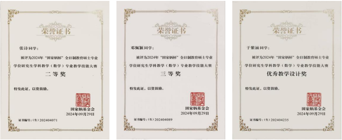 此次比赛成绩充分展现了学院教育硕士扎实的教育教学水平。数学科学学院始终以提升研究生综合素质、涵养师范生教育情怀为目标,秉持“以赛促练、以赛促教、以赛促改”的理念,鼓励研究生积极参与各类竞赛活动,为学生的专业发展和成长提供全方位的支持和保障。今后,学院将进一步优化教育教学理念,继续加强教育硕士教育教学实践能力的培养,持续提升硕士研究生人才培养质量。