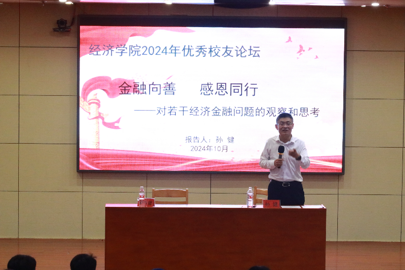 曲阜师大经济学院讯 10月9日下午,经济学院邀请曲阜师大政治系1992级校友、中国民生银行上海分行发展规划部总经理孙健为2024级本科生、研究生作《金融向善 感恩同行——对若干经济金融问题的观察和思考》报告。经济学院李传健、毕文波、王传会、尹凯等老师与2024级研究生、本科生聆听了报告,报告会由经济学院院长李传健主持。
