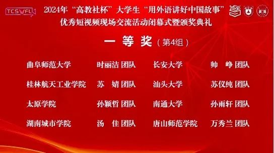 曲阜师大外国语学院讯 近日,由中国英汉语比较研究会指导,南京大学、湖南大学主办,高等教育出版社协办的2024年“高教社杯”大学生“用外语讲好中国故事”优秀短视频现场交流活动举办。曲阜师大外国语学院2022级英语师范生时丽洁及其团队成员张立鑫、陈佳悦、董雨琦在吉锡媛和刘萍老师指导下荣获山东省特等奖、国家级一等奖,华体会官方网页版_华体会(中国)获优秀组织奖。