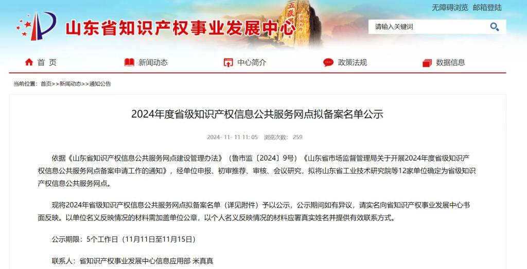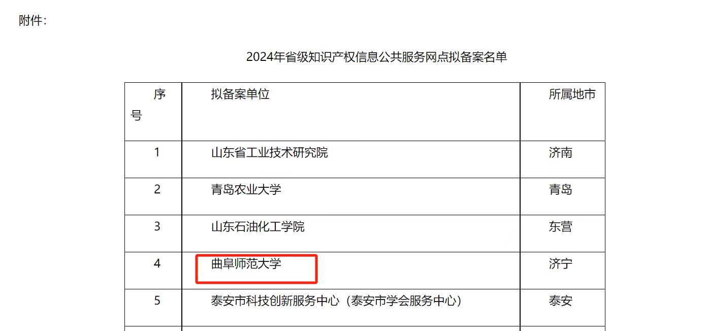 曲阜师大图书馆讯 近日,山东省知识产权事业发展中心发布2024年度省级知识产权信息公共服务网点备案名单,曲阜师范大学作为济宁地区唯一获批单位,成功入选省知识产权信息公共服务网点。