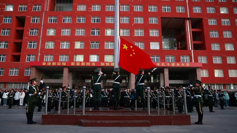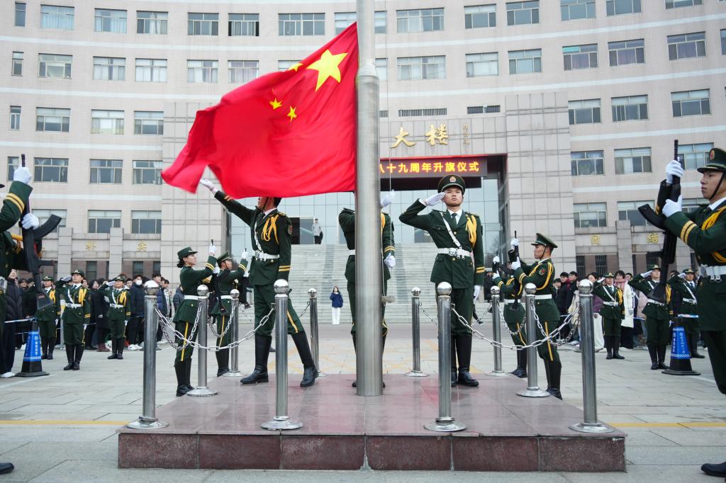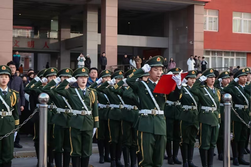 东方欲晓,国旗护卫队迈着铿锵有力的步伐,昂首阔步护卫国旗走向升旗台。在师生的庄严注目下,伴随着雄壮的国歌声,鲜艳的五星红旗与初升的太阳一同冉冉升起,迎风飘扬在冬日晨曦中。