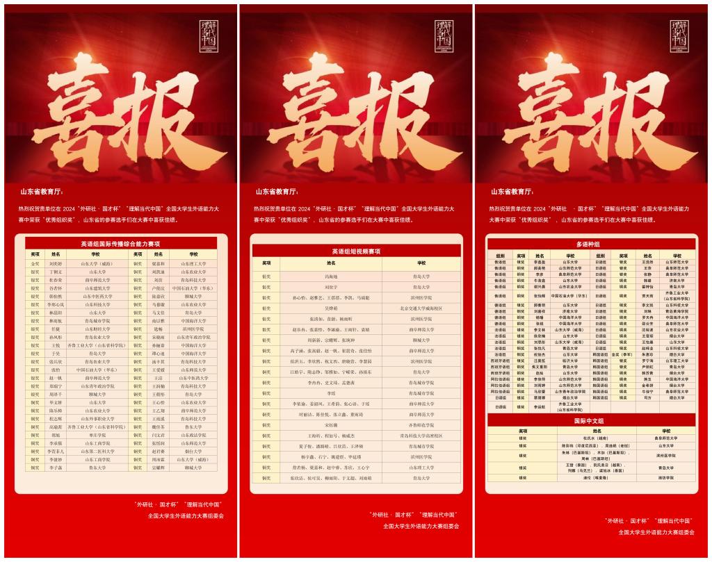 曲阜师大外国语学院讯   近日,2024“国才杯”“理解当代中国全国大学生外语能力大赛圆满落幕曲阜师大外国语学院学子凭借出色的专业素养,在国赛中斩获了22铜的优异成绩