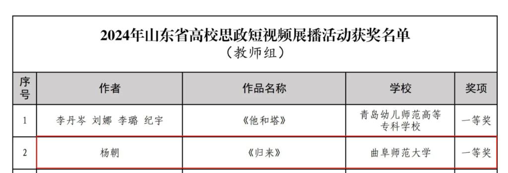 曲阜师大辅导员在2024年山东省高校思政短视频展播活动中荣获教师组一等奖