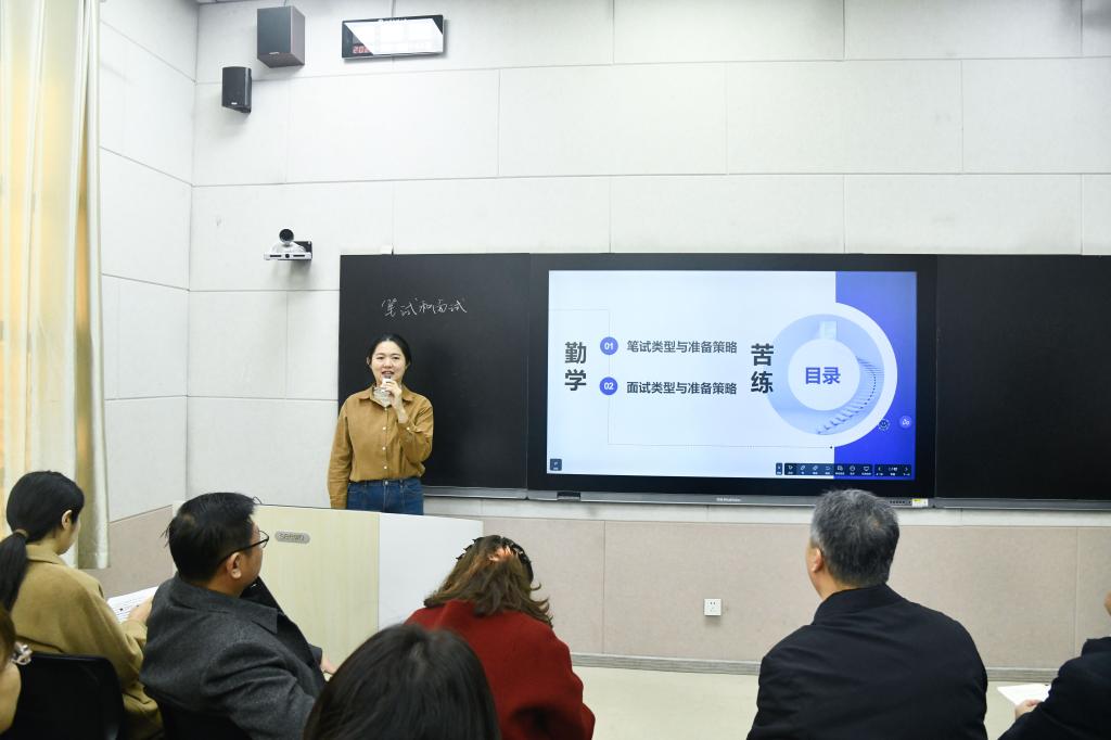 本次活动遴选了以辅导员为主要师资力量的大学生职业生涯规划、大学生就业与创业指导、军事理论课、美育课中授课能力突出的四位辅导员进行了现场授课展示。其中,高思明老师讲授了大学生就业与创业指导课中《笔试与面试》章节,高原老师讲授了美育课《音乐鉴赏》中《共产党精神谱系声入人心》章节,张艺凡老师讲授了大学生职业生涯规划课中《追寻职业目标》章节,孙泽玮老师讲授了军事理论课中《国际战略形势》章节。四位老师准备充分、各有特色,授课过程顺利流畅,圆满完成了授课展示。