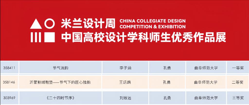 米兰设计周-中国高校设计学科师生优秀作品展由中国教育国际交流协会、中国高等教育学会发起并主办,为全国艺术学科师生搭建起展示专业才华和创作水平的国际化交流学习平台。在本次大赛中,传媒学子运用活跃思维、多元视角,创新内容表现形式,赋予传统节气文化全新的生命力与活力。其中由传媒学院教师孔勇指导,2024级传媒学子李子涵创作的作品《节气流韵》荣获国家级一等奖,2024级传媒学子王远鸽创作的作品《沂蒙割绒鞋垫——节气下的匠心独韵》荣获国家级二等奖,2023级传媒学子刘致远创作的作品《二十四时节序》荣获国家级三等奖,充分展现出传媒学子扎实的专业水准和独出心裁的创新精神。