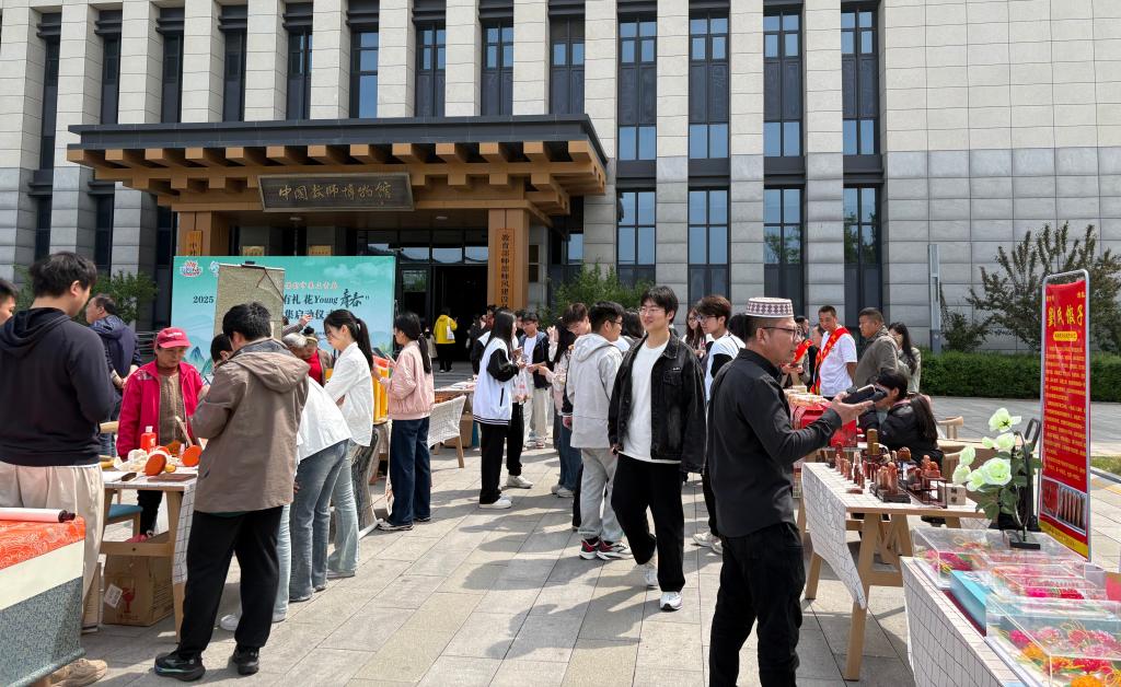 在市集现场,三孔文旅、尼山文旅、新华书店等30余家文创企业和非遗传承人展示展销了200多种文创商品,从精美的手工艺品到富有创意的纪念品,每一件都别具匠心,传统工艺与现代设计碰撞出火花,承载着曲阜深厚的文化底蕴,展现出文化“两创”的新活力。市集还设置了现场体验环节,师生们踊跃参与拓片、投壶、射箭等非遗体验活动。在非遗传承人的耐心指导下,大学生亲手制作拓片,感受古老技艺的魅力;体验投壶、射箭,仿佛穿越时空,感受古人的雅致生活;尝试篆刻,在方寸之间体会金石文化的韵味。现场还准备了孔府糕点、孔府煎饼等美食,让大学生们品味美食,感受曲阜的饮食文化。