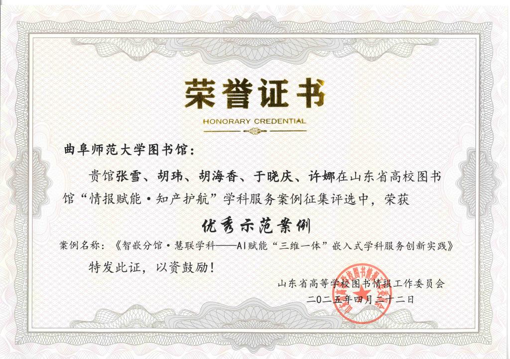 曲阜师大图书馆讯 4月22日,山东省高校图书馆学科服务工作研讨会在中国海洋大学隆重举行。曲阜师大图书馆凭借"智嵌分馆·慧联学科——AI赋能'三维一体'嵌入式学科服务创新实践"项目,在众多参评案例中脱颖而出,荣获"优秀示范案例",华体会官方网页版_华体会(中国)获评"优秀组织单位"。