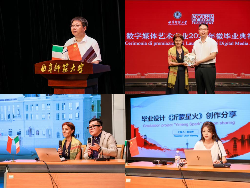 在2025届数字媒体艺术(中外合作办学)“微毕业典礼”环节,中意双方教师代表为毕业生代表拨穗并颁发学位证书,优秀毕业生现场分享毕业作品创作心得、展示学习成果,让考生和家长深切感受大学毕业氛围。意大利弗洛西诺内美术学院校长Stefania di Marco女士现场作招生宣讲。活动现场还设有2025届数字媒体艺术(中外合作办学)毕业作品展、报考咨询现场答疑等环节,帮助考生及家长更直接、更全面的了解传媒学院各专业录取情况、办学特色和培养模式。