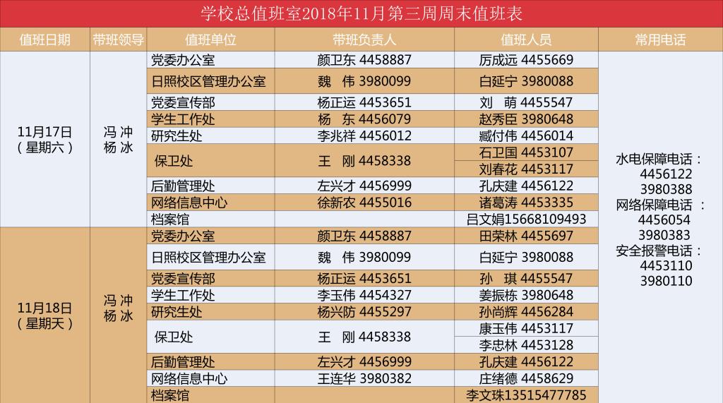 学校总值班室2018年11月第三周周末值班表