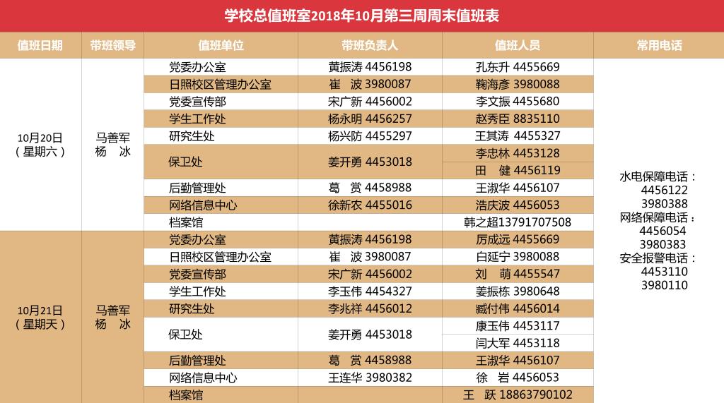学校总值班室2018年10月第三周周末值班表