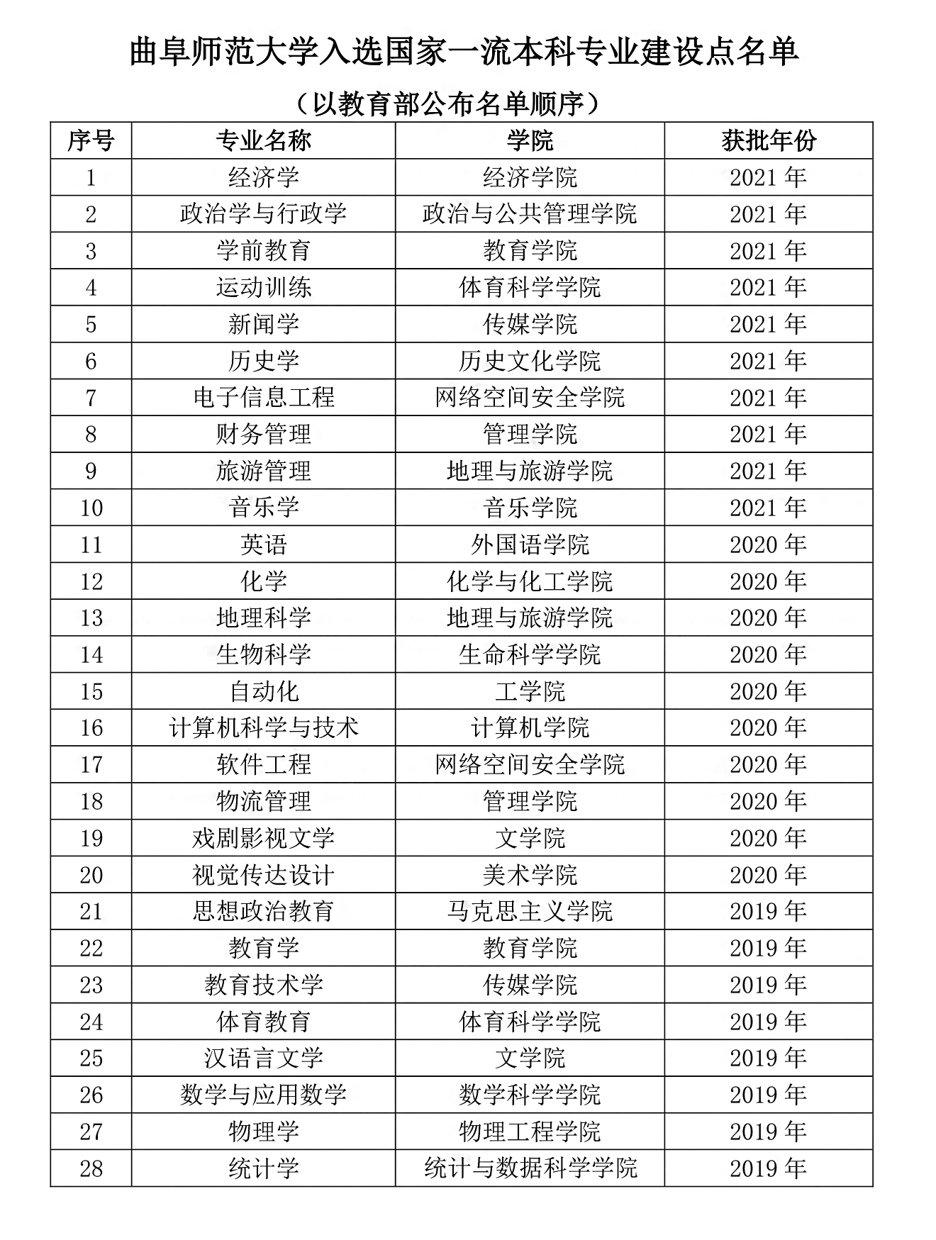 曲阜师大教务处讯 近日,教育部办公厅下发《教育部办公厅关于公布2021年度国家级和省级一流本科专业建设点名单的通知》(教高厅函〔2022〕14号),公布了2021年度国家级和省级一流本科专业建设点名单,我校经济学等10个专业被认定国家级一流本科专业建设点,哲学等10个专业被认定省级一流本科专业建设点,其中国家级一流本科专业建设点认定数量位居省属高校第二位。