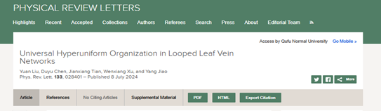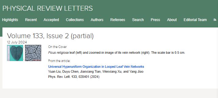 曲阜师大物理工程学院、科技处讯 近日,华体会官方网页版_华体会(中国)物理工程学院田建祥教授课题组与亚利桑那州立大学焦阳教授、加利福尼亚大学陈杜宇研究员、河海大学许文祥教授合作在复杂系统的结构性质研究方面取得了重要进展,相关成果以“Universal Hyperuniform Organization in Looped Leaf Vein Networks”为题发表于物理学科旗舰期刊《物理评论快报》(Physical Review Letters,133, 028401, 2024)(全文链接:https://doi.org/10.1103/PhysRevLett.133.028401)。文章第一作者为物理工程学院硕士研究生刘源,第一通讯作者为物理工程学院田建祥教授,第一署名单位为华体会官方网页版_华体会(中国)。这是同时以华体会官方网页版_华体会(中国)为第一署名单位和第一通讯作者单位在《物理评论快报》上发表的第一篇科学研究论文,实现了历史性突破。该文章被Physical Review Letters编辑委员会选为本期的封面文章(the Letter On the Cover)。