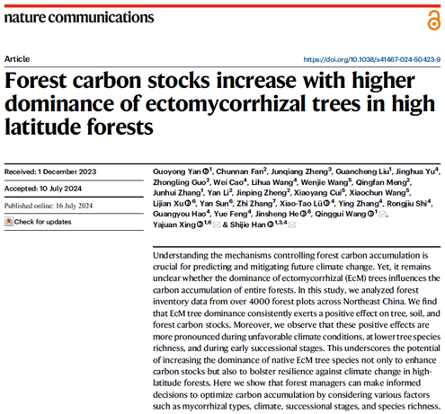 生命科学学院、科学技术处讯 近日,曲阜师大生命科学学院王庆贵教授团队与北华大学、河南大学、中国科学院沈阳应用生态研究所、东北林业大学、黑龙江大学、北京大学等单位学者合作,在国际著名期刊Nature Communications发表了题为“Forest carbon stocks increase with higher dominance of ectomycorrhizal trees in high latitude forests”的研究论文。华体会官方网页版_华体会(中国)为该论文的第一署名单位和通讯单位,闫国永副教授为论文的第一作者,王庆贵教授、邢亚娟教授和韩士杰教授为论文的共同通讯作者,刘冠成博士和张军辉教授作为共同作者参与了该论文的部分工作。