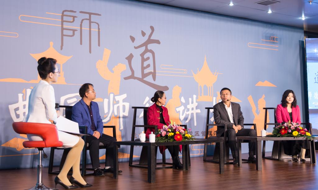 伴随着四名曲园学子深情朗诵的《师德如山》,本期“曲园师德讲坛”正式拉开帷幕。传媒学院优秀教师卢长春主持了讲坛活动。政治与公共管理学院教师张晓琼,工学院教师宗广灯,法学院教师张强和音乐学院教师张建华四位嘉宾,就“师道”分别表达了各自的见解,并与现场观众分享了教育生涯中难忘的育人故事。
