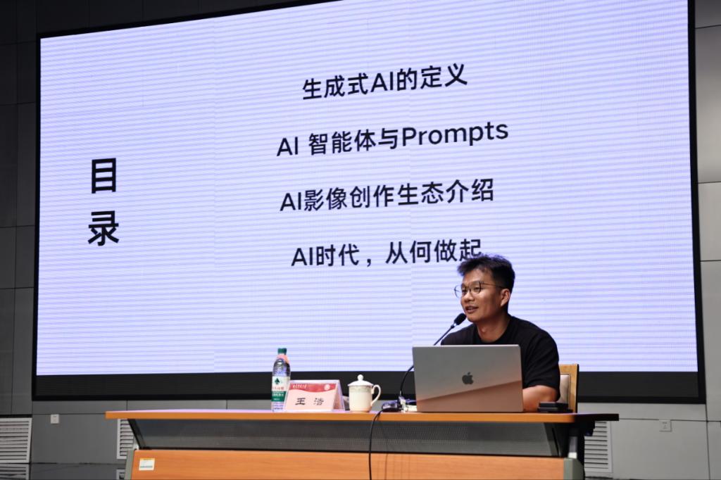在报告中,王浩围绕“AIGC革命:重塑影视传媒的创意与制作”主题,从生成式AI的定义、AI智能体与Prompts、Al影像创作生态介绍和AI时代下从何做起四个版块为现场师生详细解读了生成式AI的主要类型与实际应用。他以简单的基础模型和大语言模型为例,结合行业动态、自身学习经历以及AI生成视频案例的应用,生动展现了AI功能多样、应用范围广泛的特点。王浩全面讲解了生成式AI的驱动原理和大语言模型的基本功能,让师生深入了解了AI的基本原理和场景应用,进一步拓展了师生视野和认知。