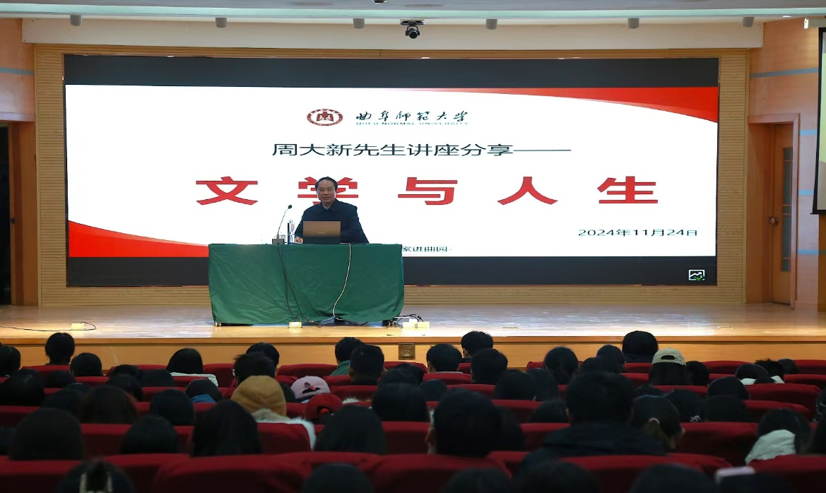 文学院讯  11月24日、25日晚,著名作家、茅盾文学奖得主周大新先生应邀来校为文学院师生分别作了题为《文学与人生》和《小说创作漫谈》的学术报告。文学院党委书记左兴才出席会议,学院师生六百余人参加本次报告会。报告会由文学院教授刘聪、副院长李杰俊分别主持。