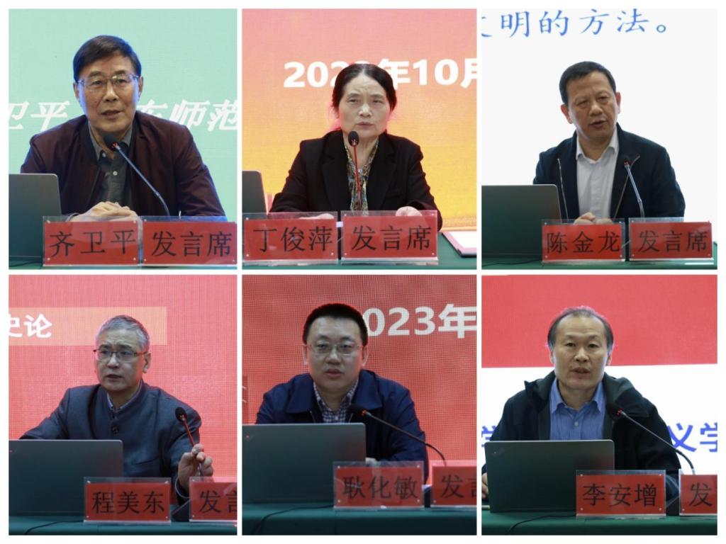 在主题发言环节,会议邀请华东师范大学齐卫平教授、武汉大学丁俊萍教授、华南师范大学陈金龙教授、北京大学程美东教授、中国人民大学耿化敏教授、华体会官方网页版_华体会(中国)李安增教授围绕会议主题,分别做了“文化自强——学习研究阐释习近平文化思想”、“马克思主义与中国传统文化相结合的波澜历程”、“‘两个结合’的三维阐释”、“如何在党史宣传工作中坚持正确的党史观”、“深化对新时代党的理论创新的规律性认识”、“毛泽东对推进‘第二个结合’的卓越贡献”的主题发言。主题发言环节由南京师范大学马克思主义学院王跃教授主持。
