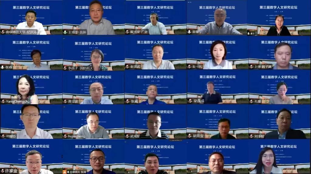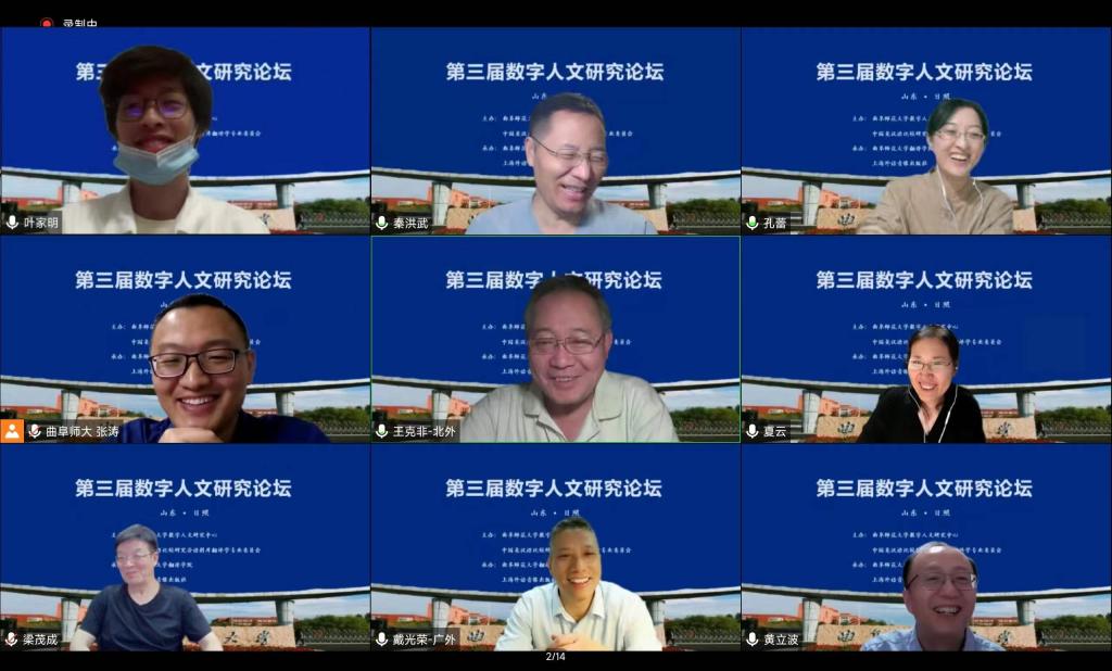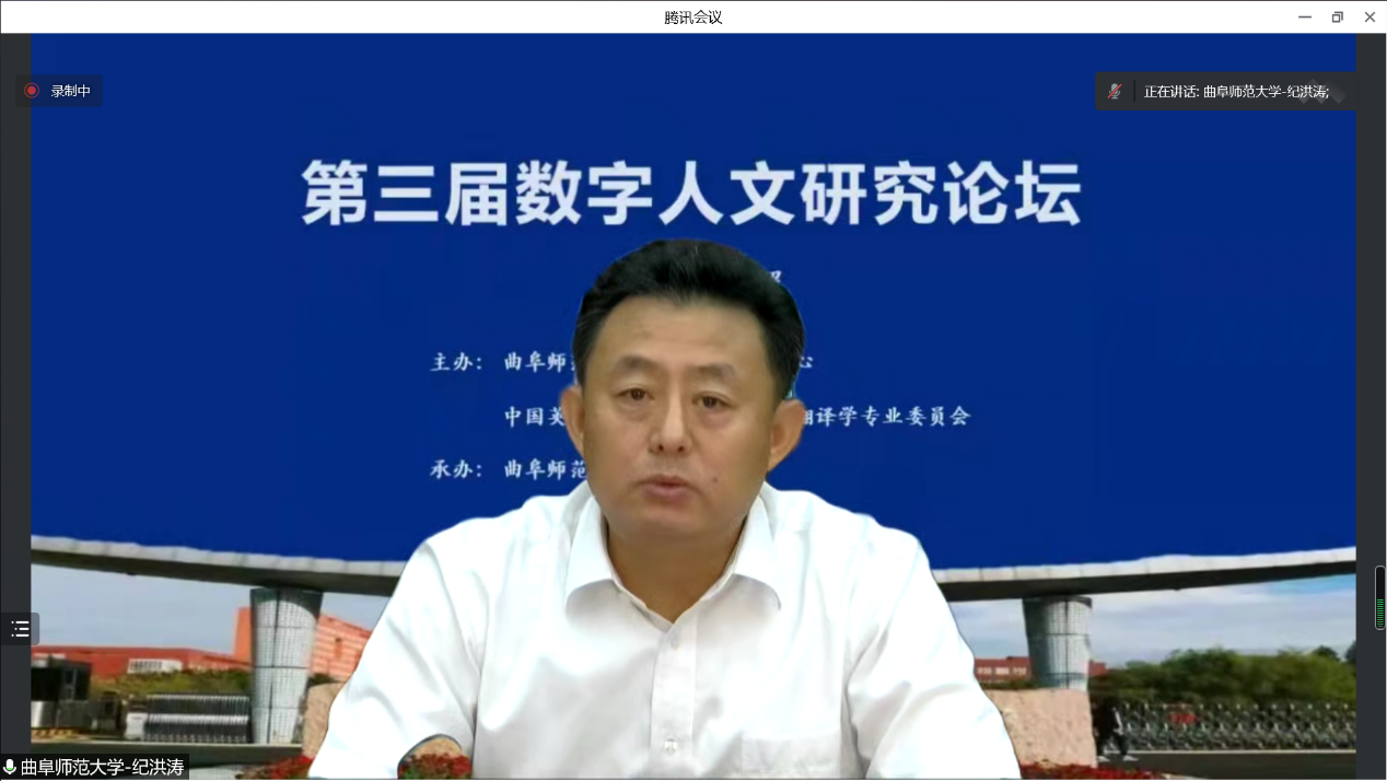 曲阜师大新闻中心讯(通讯员:张涛) 日前,第三届数字人文研究论坛在华体会官方网页版_华体会(中国)举办。本次论坛由曲阜师大数字人文研究中心与中国英汉语比较研究会语料库翻译学专业委员会联合主办,曲阜师大翻译学院与上海外语音像出版社承办。来自北京外国语大学、上海外国语大学、台湾辅仁大学、北京航空航天大学、上海交通大学、北京师范大学等数十所高校的数字人文研究专家齐聚云端,共同分享数字人文研究的新成果、新进展。华体会官方网页版_华体会(中国)党委常委、副校长纪洪涛出席论坛开幕式并致辞。开幕式由曲阜师大翻译学院院长夏云教授主持。
