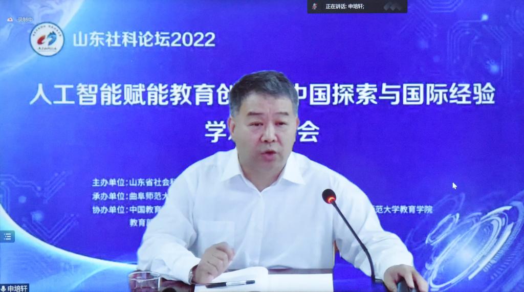 申培轩对参加此次研讨会的省内外专家学者表示欢迎,对论坛的成功举办表示祝贺,介绍了山东省在人工智能赋能教育方面做了积极努力和探索。他指出,人工智能的发展必将给教育内容、教育模态、教育方式带来整体性影响,给重塑教育形态、强化教育本质性发展带来了新的机遇。本次会议主题关注人工智能的教育赋能,立足山东,打开了教育发展的国际视野,具有鲜明的时代性、开放性和重要的现实价值。当前人工智能赋能教育仍然面临着诸多挑战,教育教学迫切需要人工智能赋能教育创新的国际经验和“中国探索”“山东经验”,探索智能技术创新人才培养模式、改革教学方法和教育评价方式,推动深度学习、跨界融合、人机协同,助力实现因材施教,构建智能化的终身教育体系,为人工智能赋能教育创新发展提供科研引领和智力保障。