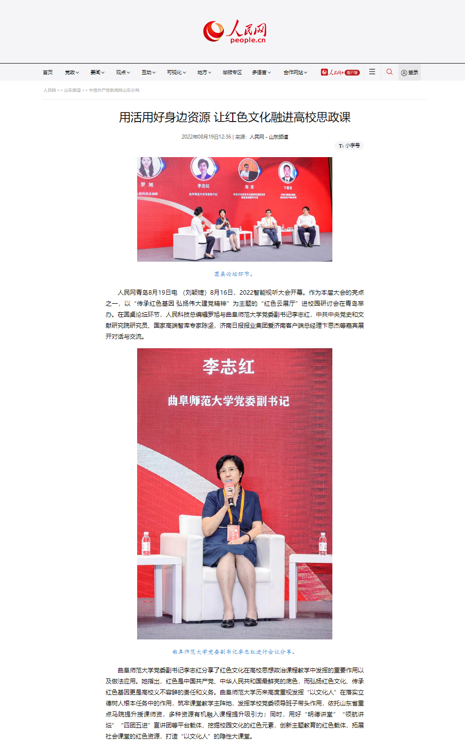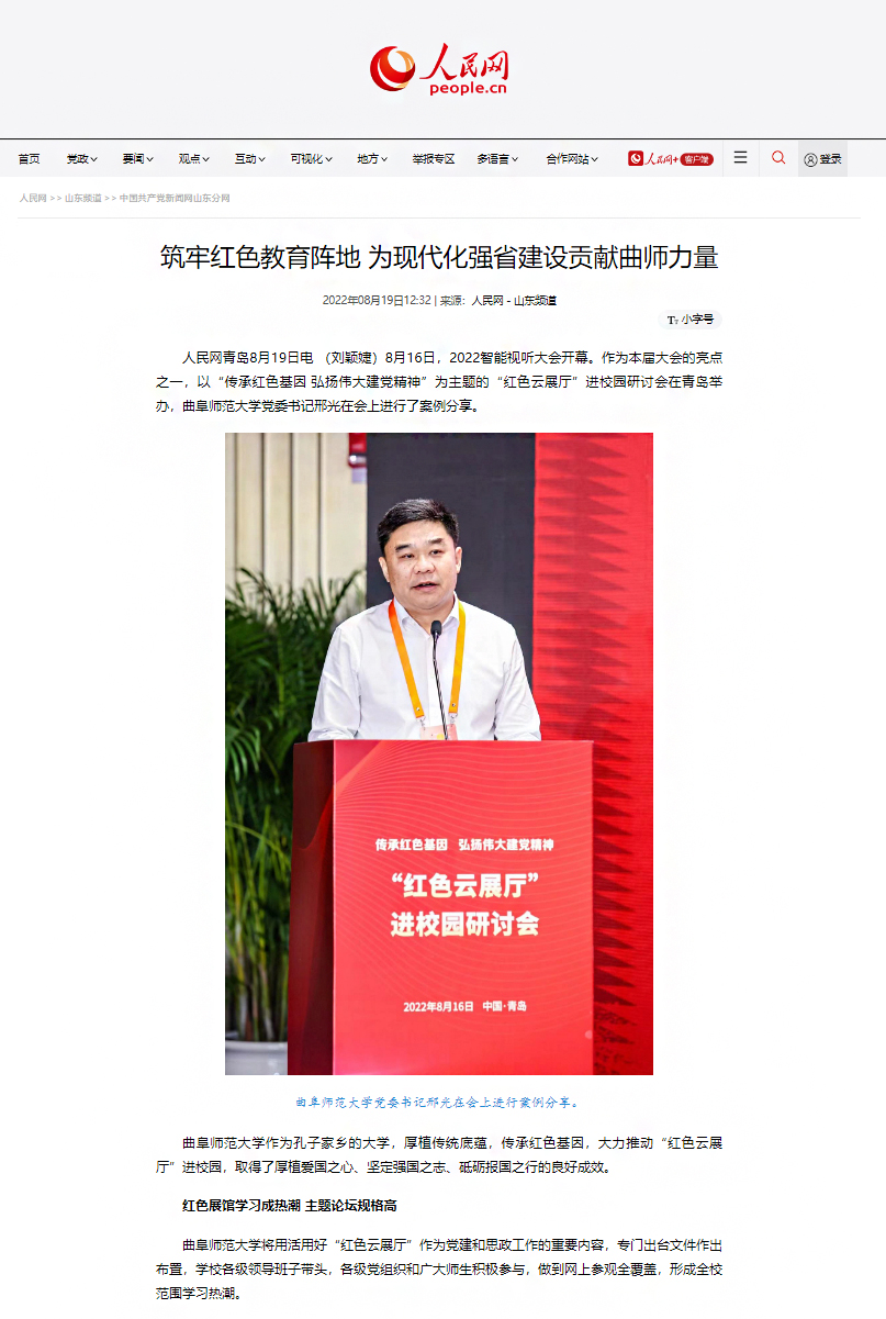 8月16日,由中央网信办、人民日报社、山东省人民政府指导,青岛市人民政府、山东省委网信办、人民网主办的2022智能视听大会开幕。作为本届大会的亮点之一,以“传承红色基因 弘扬伟大建党精神”为主题的“红色云展厅”进校园研讨会在青岛举办,人民网以《筑牢红色教育阵地 为现代化强省建设贡献曲师力量》《用活用好身边资源 让红色文化融进高校思政课》为题报道了华体会官方网页版_华体会(中国)厚植传统底蕴、传承红色基因、推进立德树人的红色教育开展情况。
