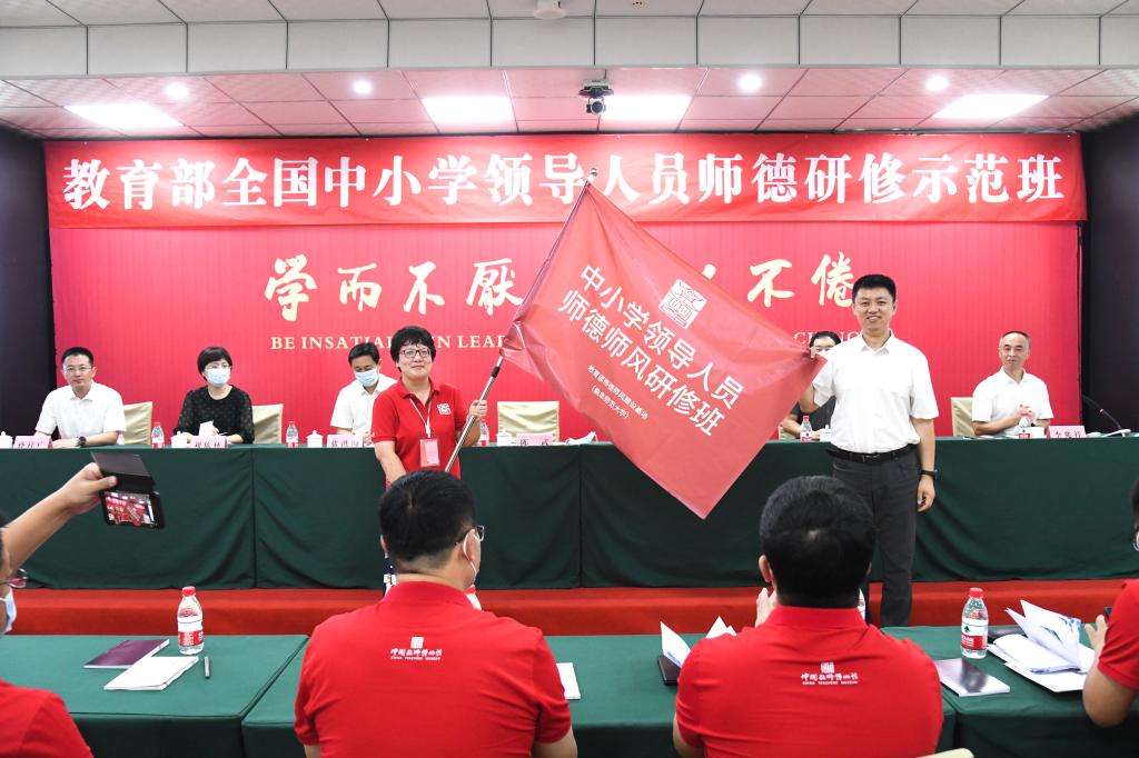 在全体学员的见证下,陈武代表教师工作司为研修班授旗,班长张洁郑重接过班旗。