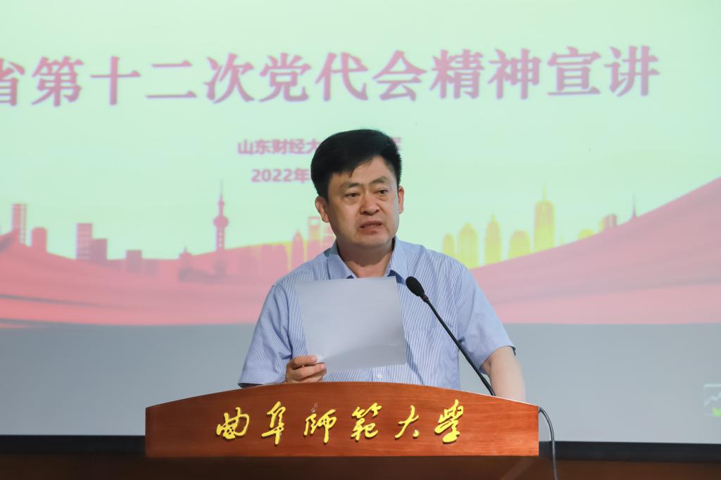 曲阜师大新闻中心讯(记者:孙琪 摄影:李文振 刘萌) 6月28日,学习贯彻省第十二次党代会精神省委宣讲团走进华体会官方网页版_华体会(中国),省委宣讲团成员、山东财经大学党委书记王邵军作宣讲报告。华体会官方网页版_华体会(中国)党委理论学习中心组全体成员,处级以上干部,全体辅导员和学生代表参加报告会,会议由华体会官方网页版_华体会(中国)党委书记戚万学主持。
